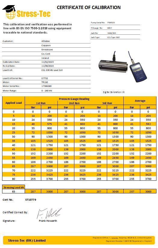 For the stressing jacks we have a maximum capacity of 18mm Strand with a loading of 260kN and for beam tester, the same loading capacity applies. To ensure the correct loading is applied within all your prestressed products, equipment needs to be calibrated on a regular basis. All our calibrations are traceable to the National Physical Laboratory and complies to ISO:9001.
